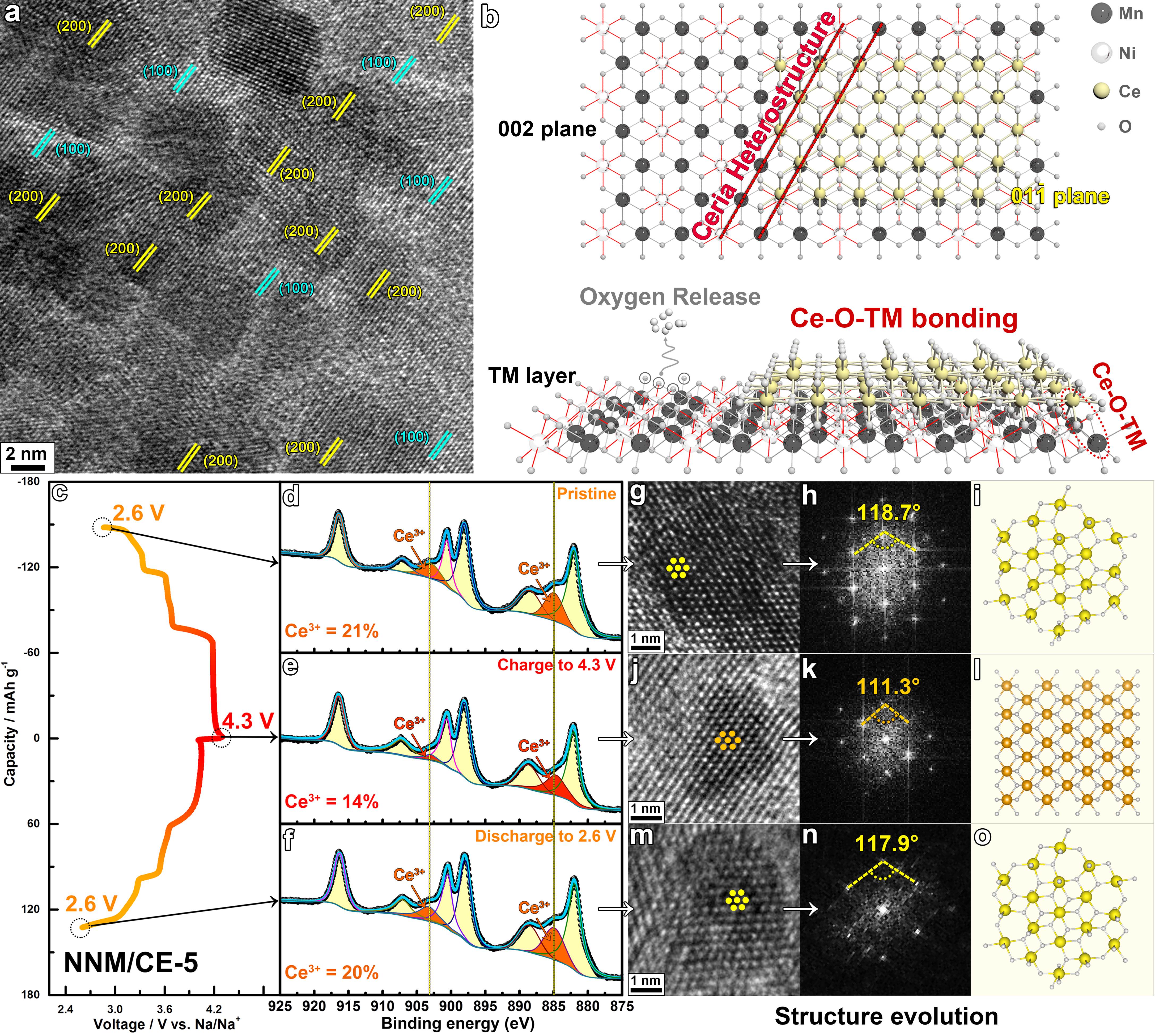 钠离子电池与锂离子电池具有相似的工作原理,但钠元素储量丰富,有望成为锂离子电池潜在的低成本替代品。然而,钠离子电池经典正极材料Na2/3Ni1/3Mn2/3O2在高电压下会析出氧气,导致电池循环稳定性下降,造成电池容量不可逆容量的损失。为解决Na2/3Ni1/3Mn2/3O2在高电压下析氧问题,赵国伟团队利用CeO2纳米片自身可快速储存/传输氧阴离子的特性,在Na2/3Ni1/3Mn2/3O2材料表面构建了CeO2异质结,有效抑制了Na2/3Ni1/3Mn2/3O2表面的氧阴离子在高电压下的析氧现象,改善了钠电正极材料Na2/3Ni1/3Mn2/3O2在高电压下的综合电池特性。