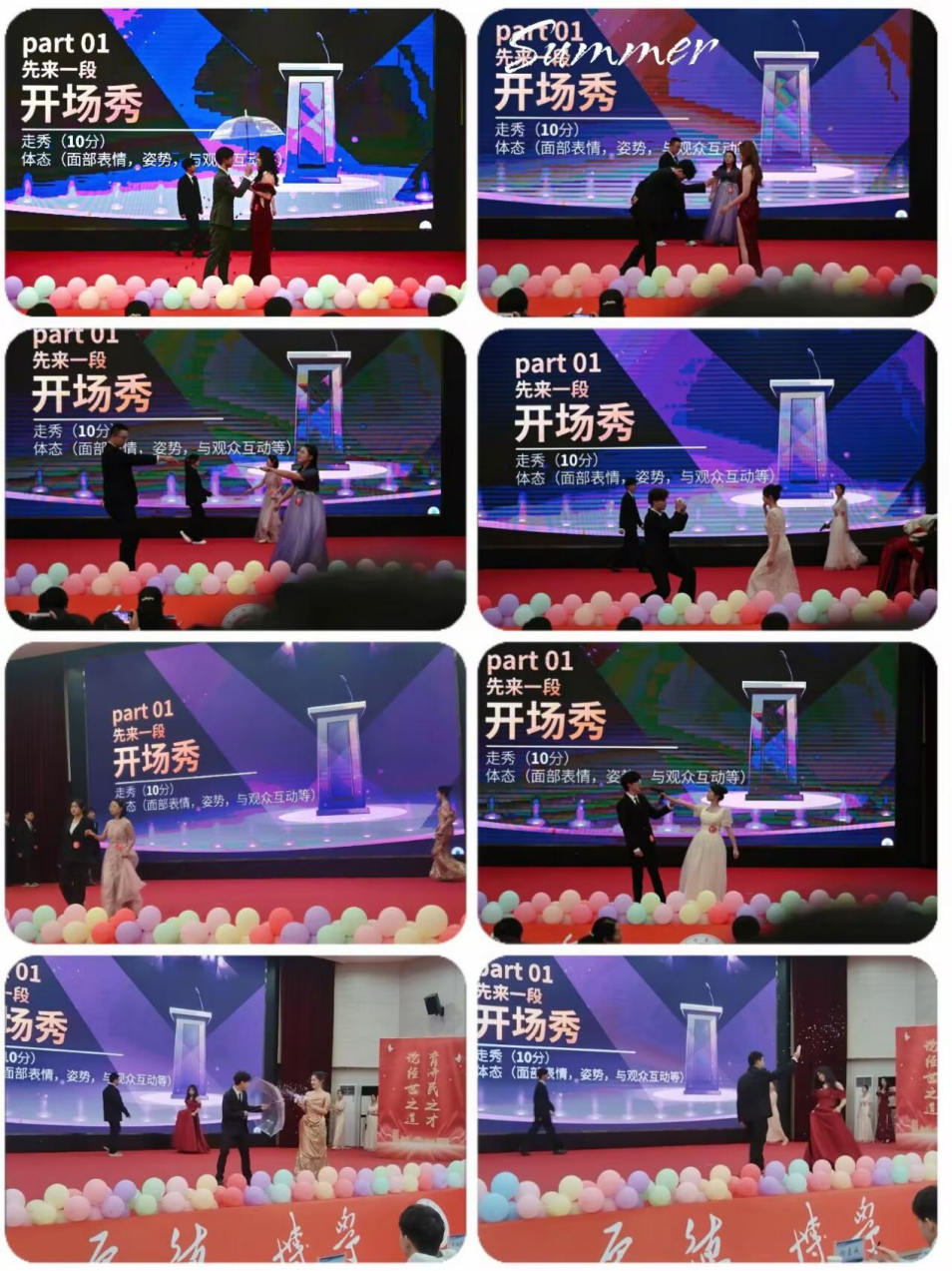 比赛第一环节开场秀。在灯光的照耀下,十六位参赛选手向观众款款走来,他们以优雅的步伐传递着自信的魅力,光彩夺目。荧幕随参赛选手而变换,别出心裁的自我介绍使得掌声、喝彩声此起彼伏。选手们通过自我介绍,展示了自己的风采和主持能力。他们有的风趣幽默,有的端庄大气,有的则充满青春活力,赢得了在场观众的阵阵掌声。